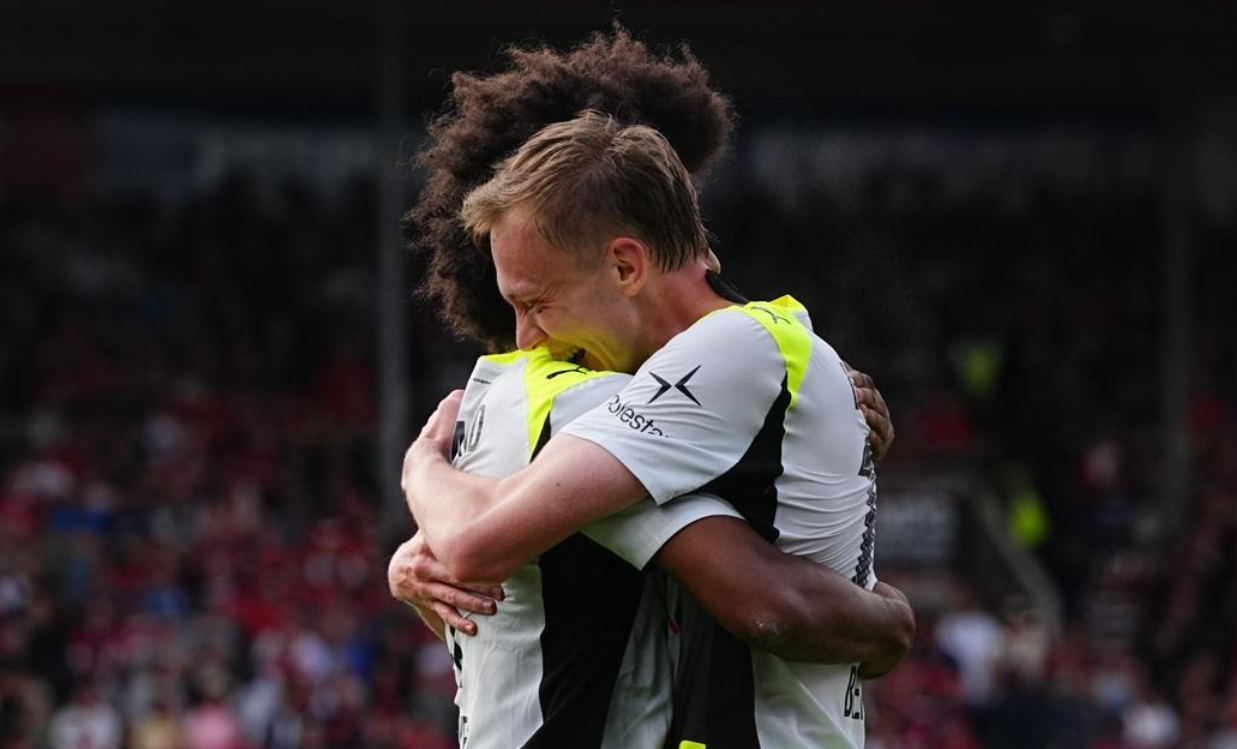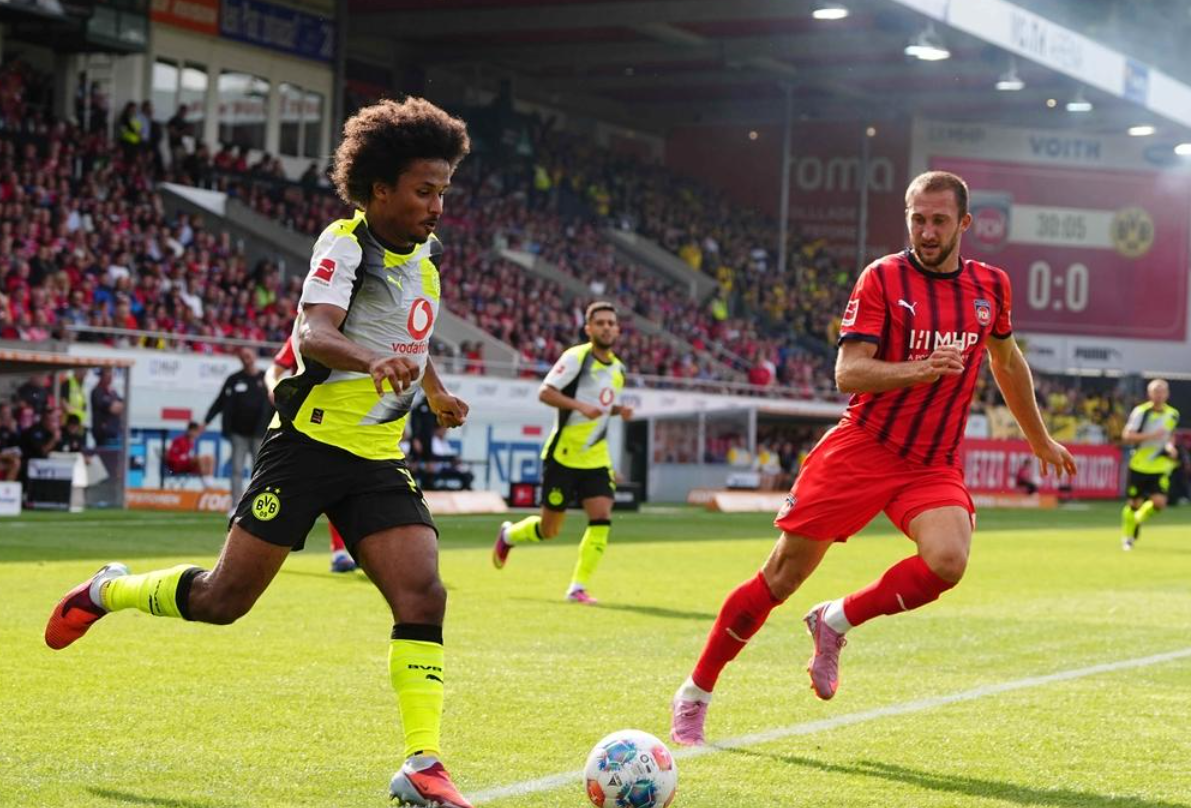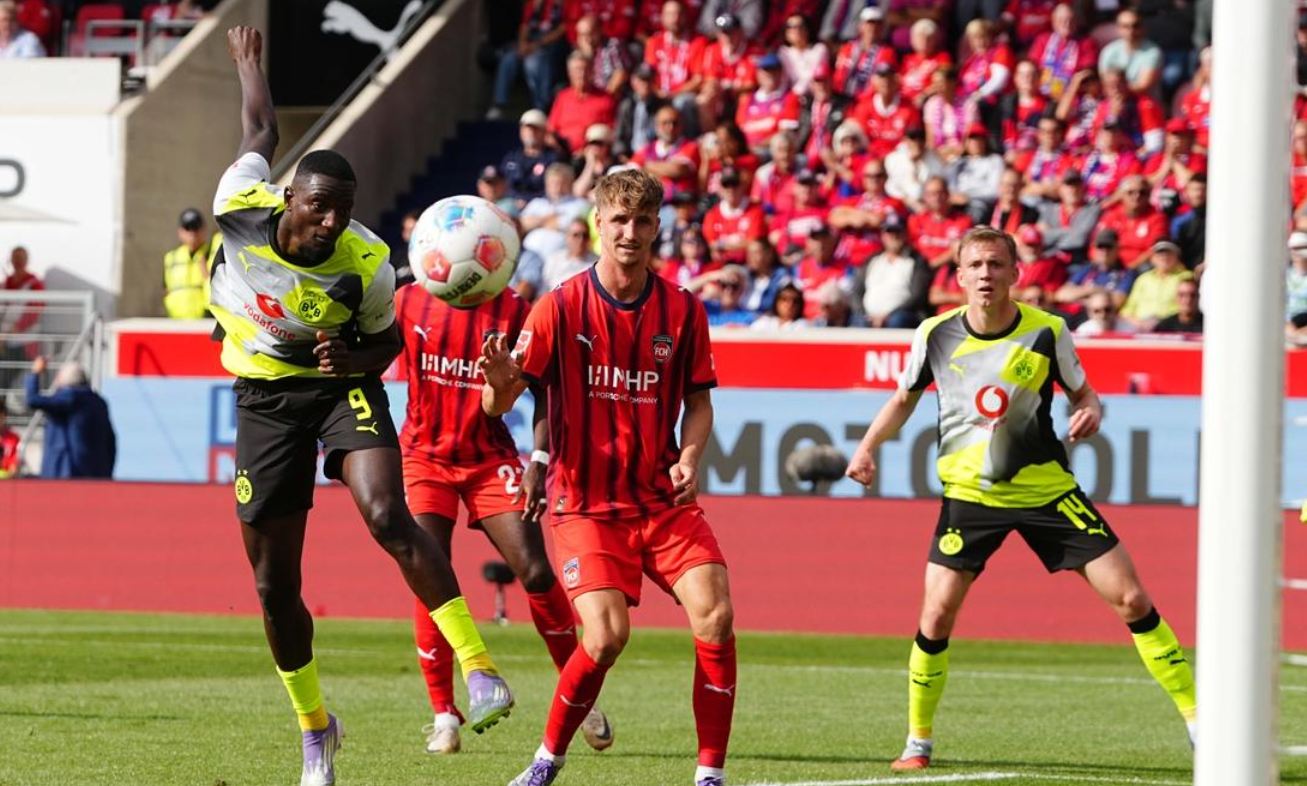 第30分钟,阿德耶米突入禁区右侧,一路内切,随即抽射,结果踢高了。3分钟后,多特蒙德进球了!瑞尔森在右侧起球传中,吉拉西后点包抄,头球顶进!门将一点反应都没有!半场临近结束,多特蒙德再进一球。阿德耶米突入禁区,获得单刀机会。但是,他没有选择自己射门,而是横传给拜尔。拜尔轻松推射空门!半场结束,多特蒙德2-0领先海登海姆。
